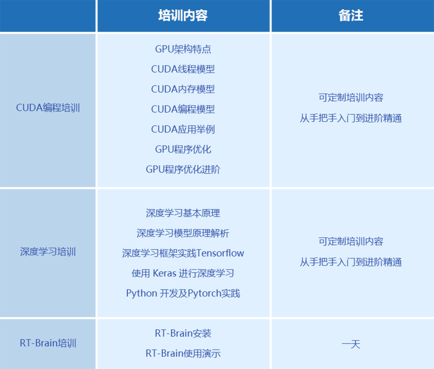 提供CUDA编程、深度学习及容天自有软件RT-Brain软件安装及使用培训。