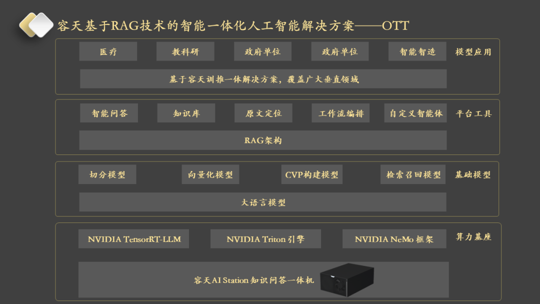 容天OTT通过私有部署策略加强数据保护,无需依赖网络连接,保证桌面环境的安全性和数据保密性,为客户提供专属的AI辅助服务。基于RAG架构、NVIDIA Triton推理引擎、NVIDIA TensorRT-LLM推理加速库及NVIDIA NeMo框架,OTT在知识问答领域设立了效能新高度,答案的准确性和响应时间均展现出超越市场同级产品的性能。此外,OTT允许用户通过工作流定制,开发符合自身需求的智能应用,实现了个性化智能辅助的深度集成。